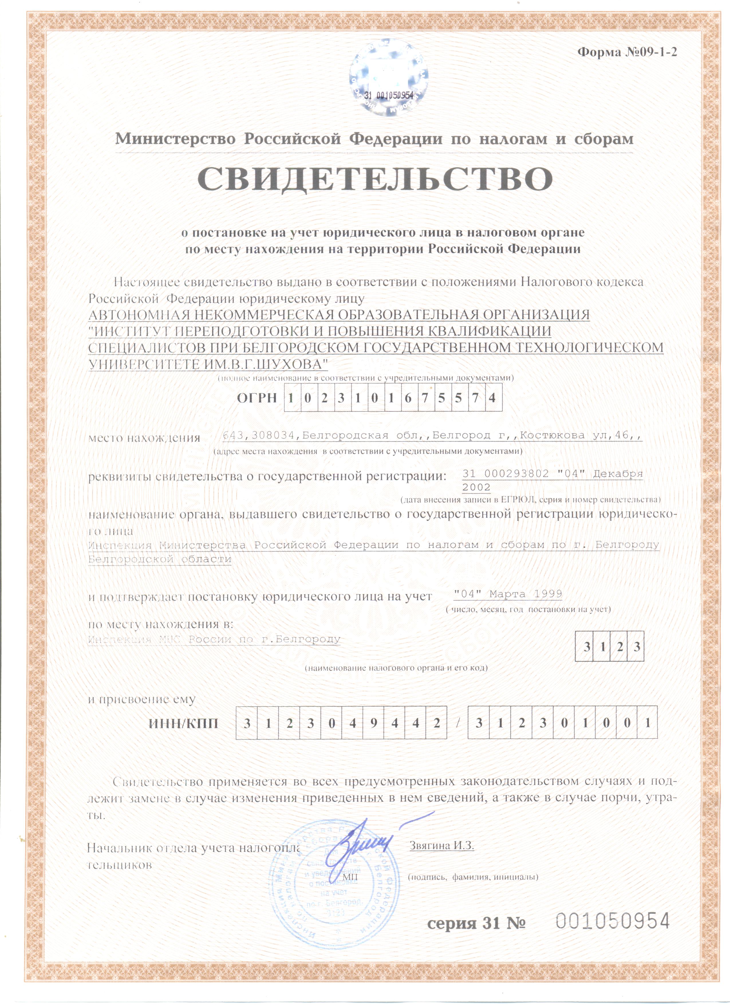 - свидетельство о постановке на учет российской организации в налоговом органе по месту ее нахождения;